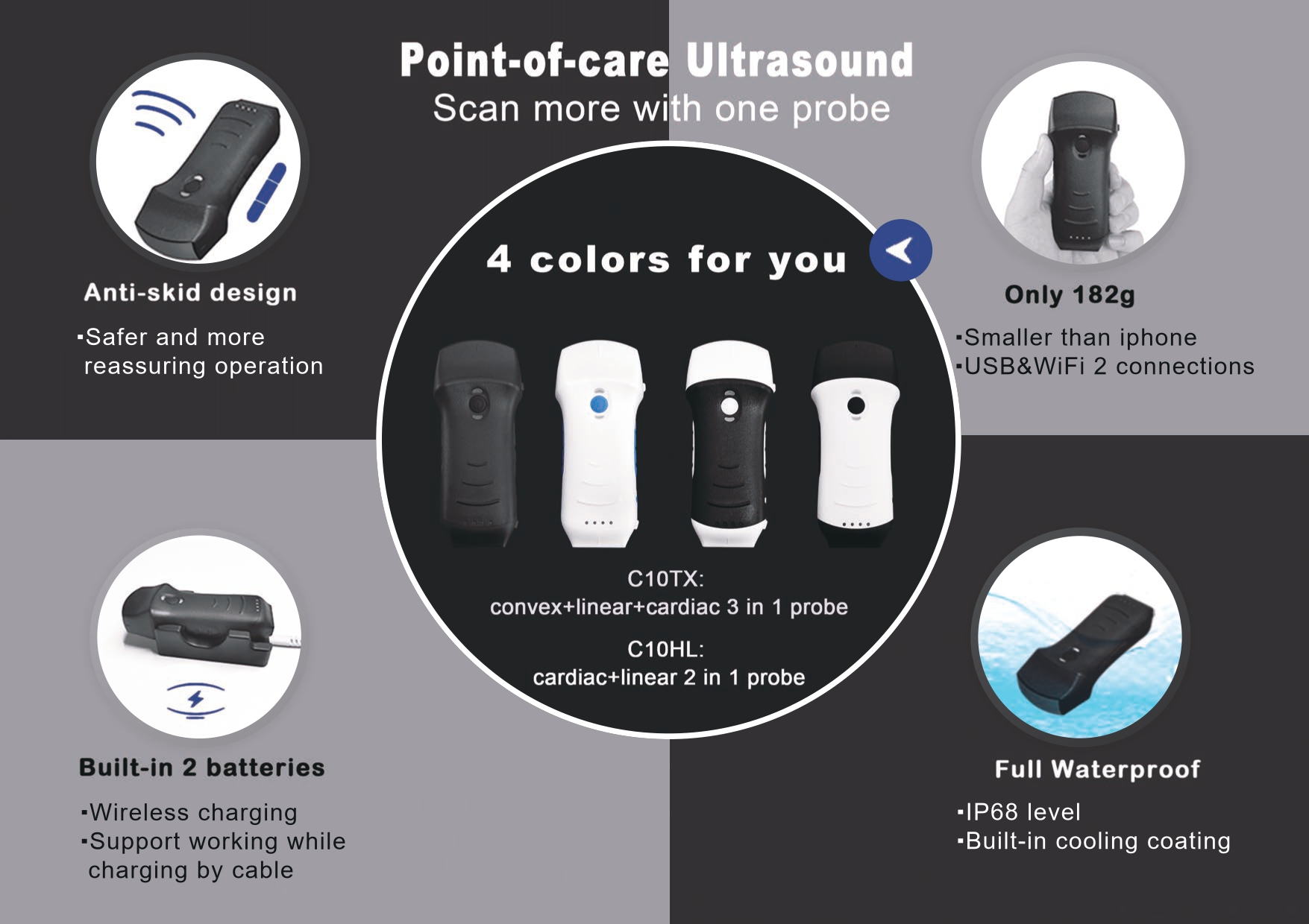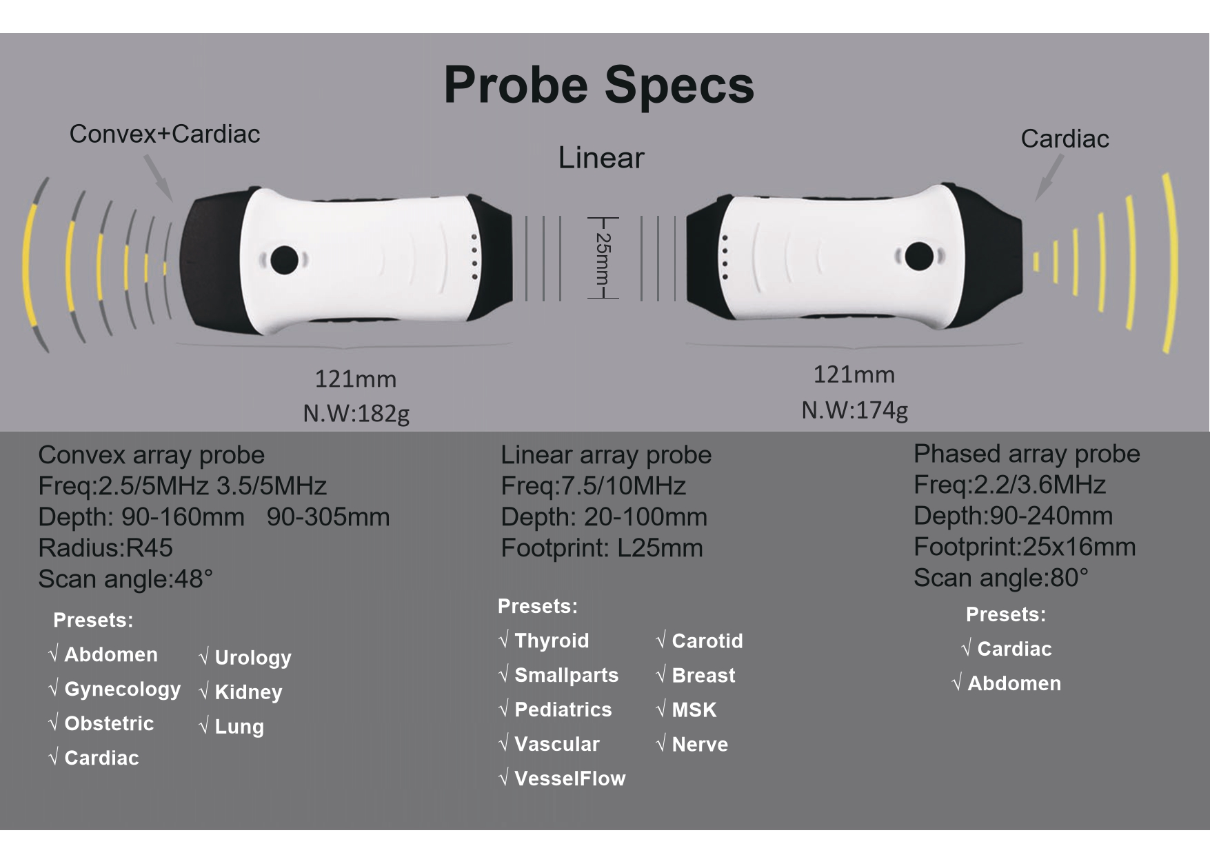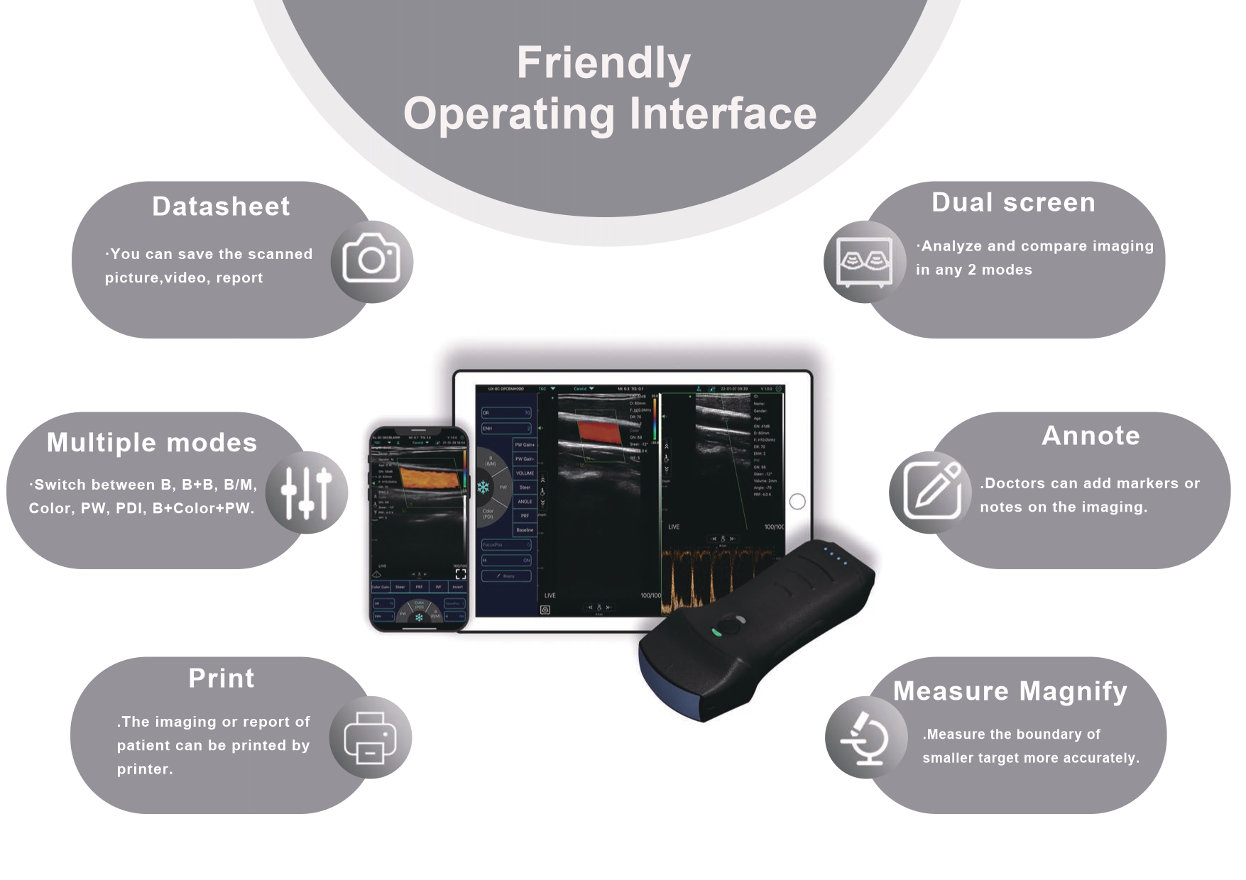 | Dual Head Multi-Probe Design | This device comes with a dual-head probe, allowing you to use multiple scanning types in one device. |